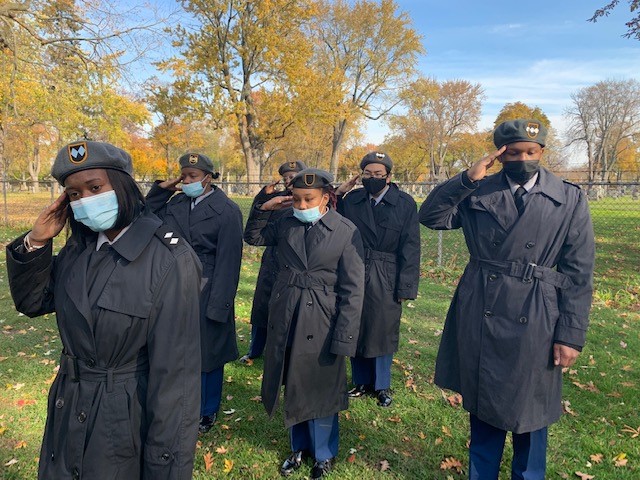 This past Veterans Day, the Detroit Historic Civil War Society hosted their 37th annual Veterans Day Observance to honor all Veterans, especially U.S. Colored and Native American Troops from Michigan’s 102nd unit. The ceremony was hosted at Elmwood Cemetery with Osborn and Renaissance High Schools’ JROTC. The program opened with a Native American ceremonial ritual, an opening prayer and a moment of silence. Renaissance cadets presented the flag while Osborn cadets laid the wreaths and roses on gravesites. Cadet Marie Sanders explains what being in JROTC means to her – “To me, being a Cadet in JROTC means everybody acts as a unit and no one gets left behind. Honoring Native American Veterans and U.S. Colored Troops with wreaths showed that they are part of that commitment too” Additionally, Cass JROTC cadets visited a nursing home to honor and spend time with a 103-year-old veteran of the Women’s Air Corps! We are DPS Proud!