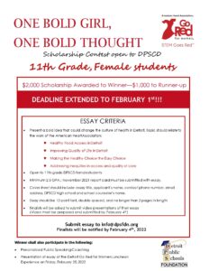 Scholarship Criteria: open to 11th grade DPSCD female students only; Minimum 2.5 GPA.; November 2021 report card must be submitted with essay. The cover sheet should include essay title, applicant’s name, contact phone number, email address, DPSCD high school and school counselor’s name. Essay should be 12-point font, double-spaced, and no longer than 2 pages in length. Finalists will be asked to submit a video presentation. The winners will participate in the following–Personalized Public Speaking Coaching and the presentation of their essay at the Detroit Go Red for Women Luncheon Experience on Friday, February 25, 2022. Essays and applications are due to info@dpscdfoundation.org by February 1st, 2022. Spread the word!!!!!